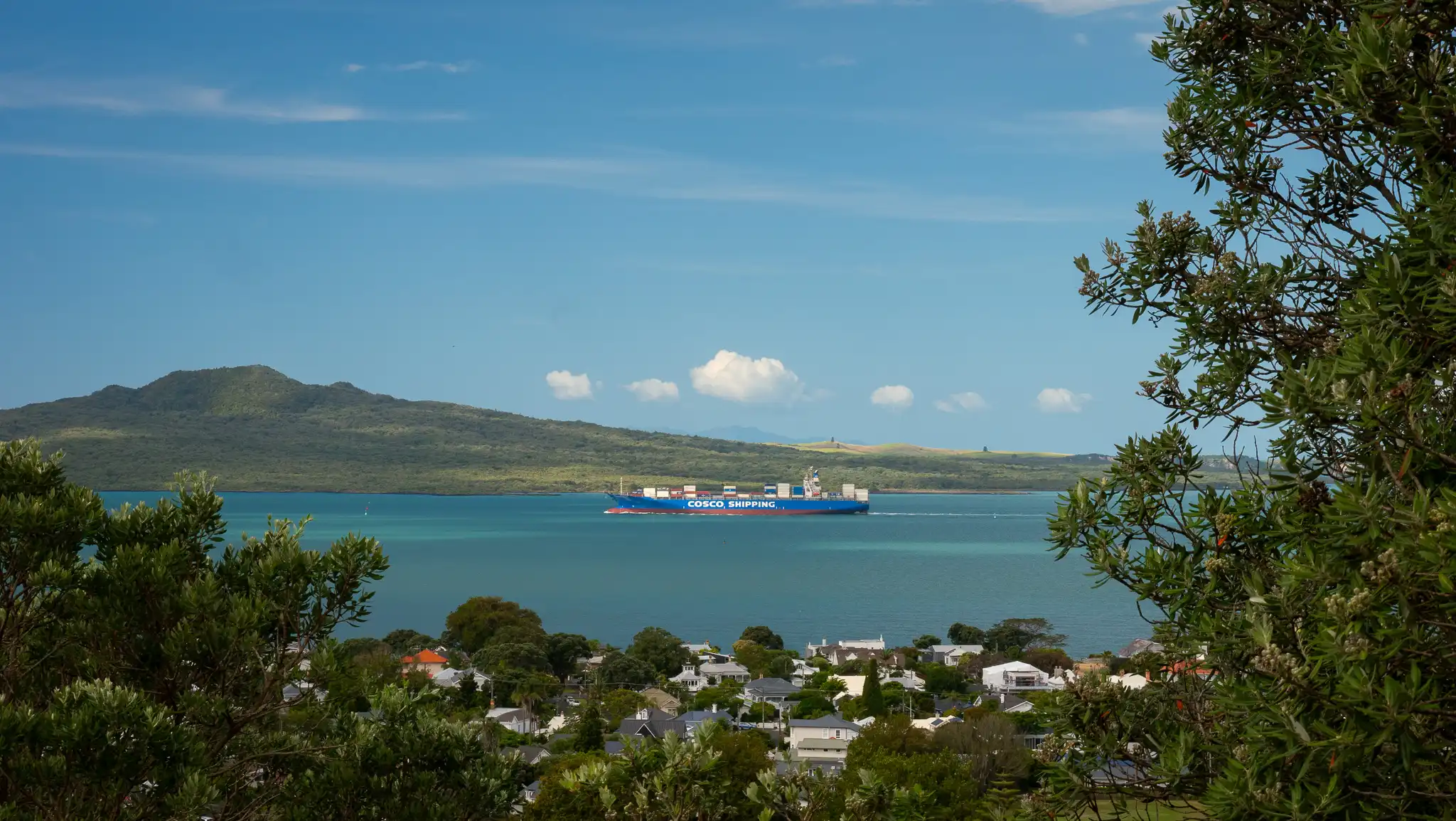 OBEN: Containerschiff passiert die Rangitoto Island und fährt über den Hauraki-Golf in den Pazifischen Ozean.